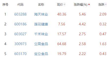 其中,海天味业、莲花健康、千禾味业、立高食品、宝立食品位列板块涨幅前五位,涨幅分别为5.46%、4.42%、2.75%、2.58%、2.22%。
