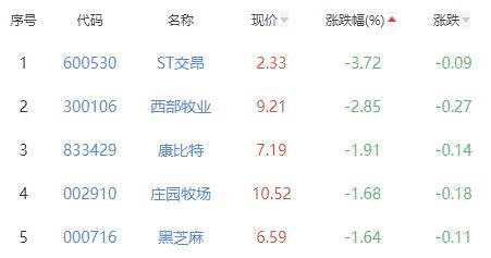 ST交昂、西部牧业、康比特、庄园牧场、黑芝麻位列涨幅榜后五位,涨幅分别为-3.72%、-2.85%、-1.91%、-1.68%、-1.64%。
