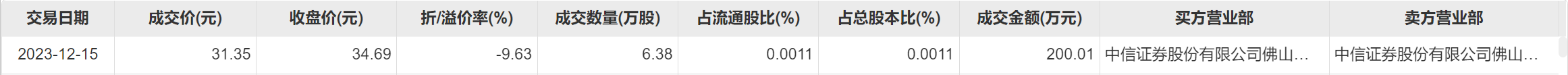 今日大宗交易成交6.38万股,成交额200.01万元,占当日总成交额的0.66%,成交价31.35元,较市场收盘价折价9.63%。