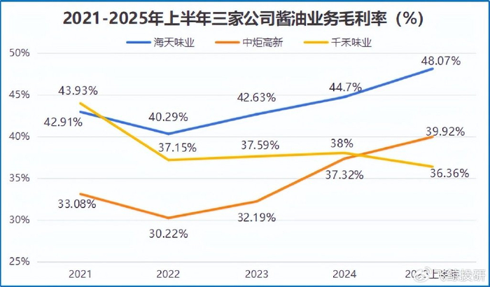 这种全方位的优势,最终在毛利率上体现得淋漓尽致。2020-2025年上半年,海天味业的毛利率一直领先于中炬高新和千禾味业,成本控制能力的差距一目了然。