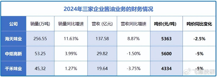 如果粗略地从单吨价格来看,确实有这种可能性。2024年海天味业酱油产品的吨价同比下降2.5%至5363元,中炬高新和千禾味业酱油的吨价也分别下降至5600元、4334元。