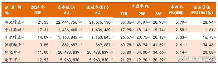 当前海天味业的PE为33.4倍,24年ROE在22%左右,净利润增长率13.75%。其相对中炬高新及千禾味业,仍享有龙头溢价。