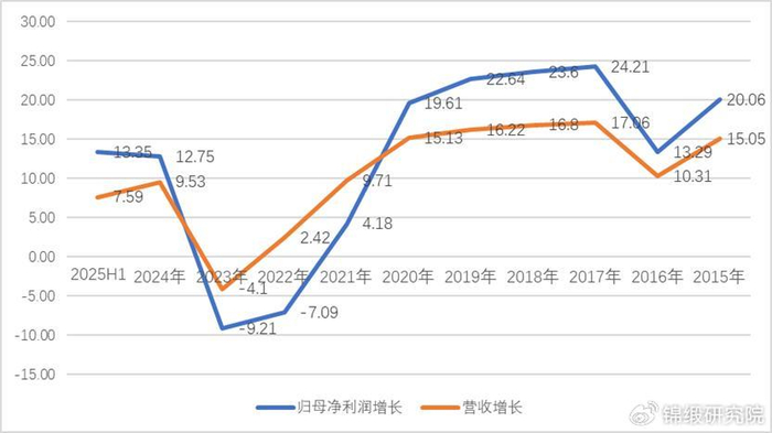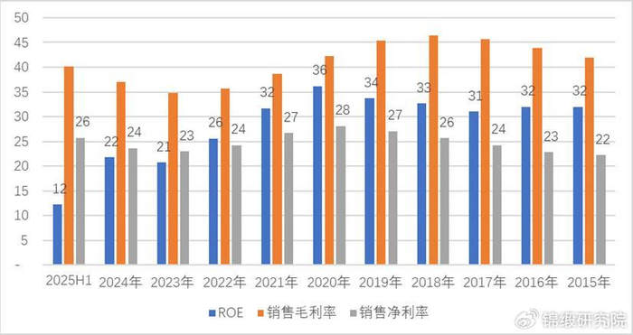 公司业绩从高速增长步入了平台期,2022年至2025年半年报其营收增长分别为2.42%、-4.1%、9.53%、7.59%,净利润增长分别为-7.09%、9.21%、12.75%、13.35%,年化净利润增长不足3%。与此同时,其ROE亦较前期大幅下滑,2022年至2025年半年报分别为26%、21%、22%、12%(年化为24%)。