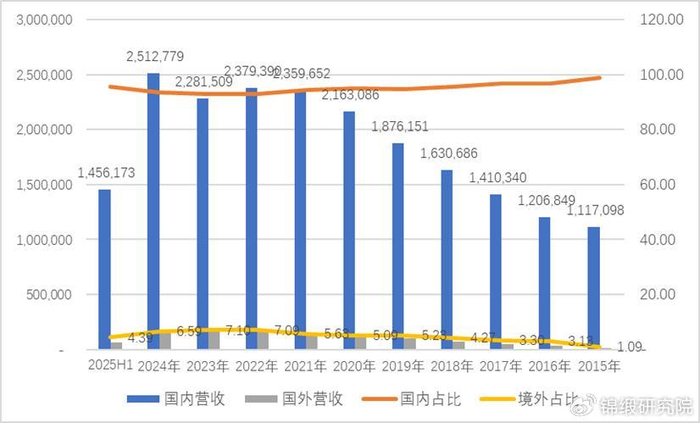 但是从数据来看,海天味业营收中95%左右来自境内,境外占比波动较大,近三年在6.5%-7%左右,但2025年上半年4.39%,较去年同期6.86%下滑2.47%。