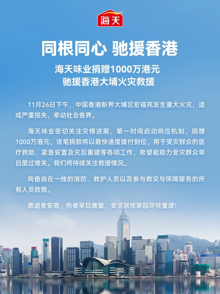 此次火情发生后,海天味业快速响应,展现了民族企业与香港社会守望相助的情谊。公司表示将持续关注救援进展,并向奋战在一线的消防、救护人员以及参与救灾与保障服务的所有人员致敬。愿逝者安息,伤者早日康复,受灾居民家园尽快重建!