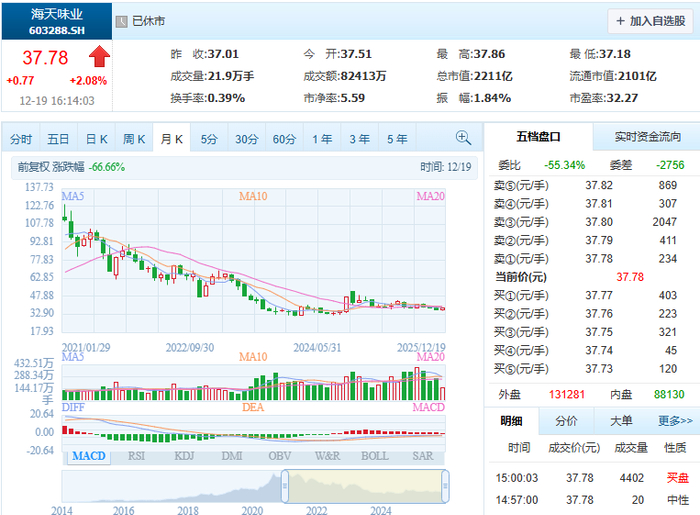 与需要不断烧钱扩张的科技企业不同,海天味业已经进入了成熟期。这意味着,未来战略上不太会建厂扩张或进行大额收购。这也意味着,在未来3-5年,公司很可能很难贡献超过10%的净利润增速。市场对这样的信号反应迅速。截至12月19日,海天味业A股股价为37.78元/股,较年初的45.9元/股已下跌17.69%。