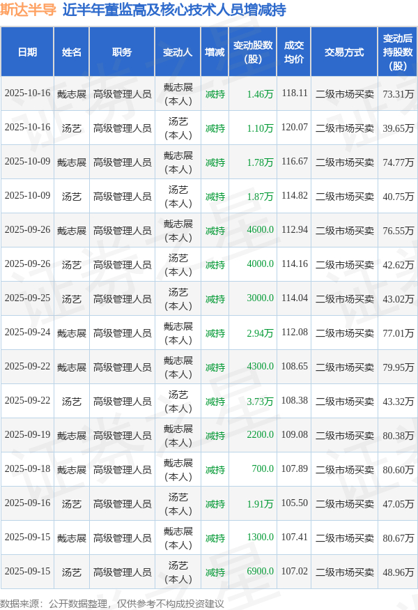 证券之星消息,根据10月17日市场公开信息、上市公司公告及交易所披露数据整理,斯达半导(603290)最新董监高及相关人员股份变动情况:2025年10月16日公司高级管理人员戴志展、高级管理人员汤艺共减持公司股份2.56万股,占公司总股本为0.0107%。变动期间公司股价上涨4.06%,10月16日当日收盘报115.11元。