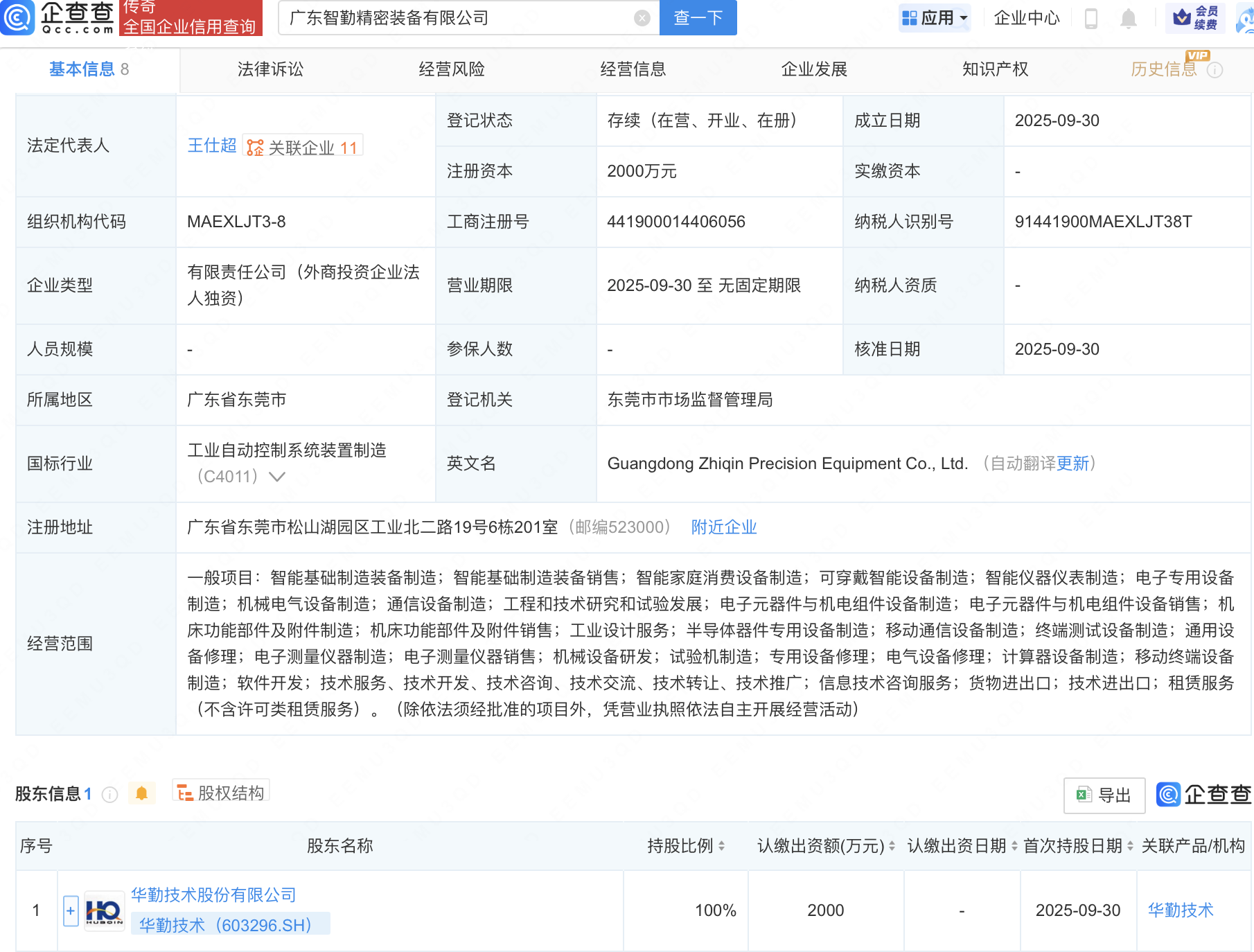 企查查APP显示,近日,广东智勤精密装备有限公司成立,注册资本2000万元,经营范围包含:半导体器件专用设备制造;移动通信设备制造;终端测试设备制造等。企查查股权穿透显示,该公司由华勤技术(603296)全资持股。