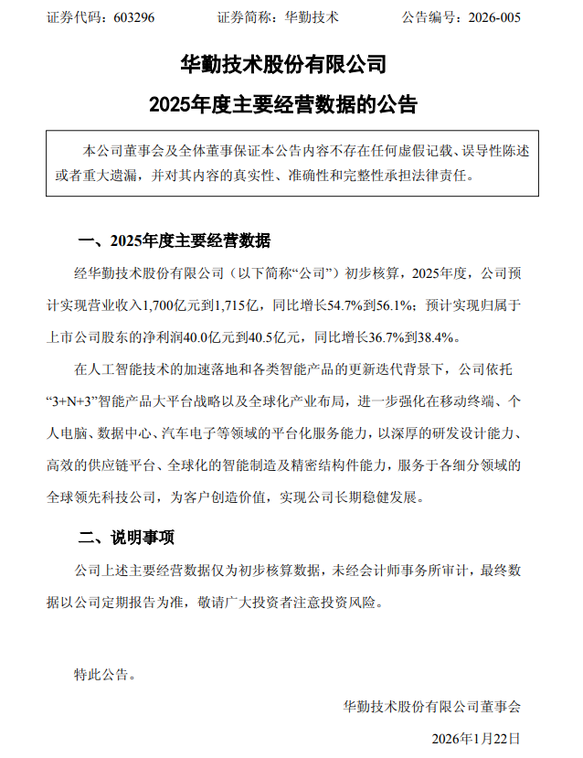 1月21日,华勤技术(603296.SH)公告称,预计2025年实现营业收入1700亿元到1715亿元,同比增长54.7%到56.1%;预计实现归属于上市公司股东的净利润40.0亿元到40.5亿元,同比增长36.7%到38.4%。