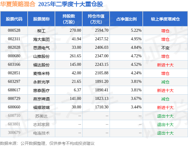 根据2025基金半年报公募基金重仓股数据,重仓该股的公募基金共4家,其中持有数量最多的公募基金为华夏基金的华夏策略混合。华夏策略混合目前规模为4.97亿元,最新净值5.058(9月19日),较上一交易日上涨1.0%,近一年上涨27.31%。该公募基金现任基金经理为陈伟彦。陈伟彦在任的基金产品包括:华夏稳健回报混合A,管理时间为2025年7月22日至今,期间收益率为6.68%。