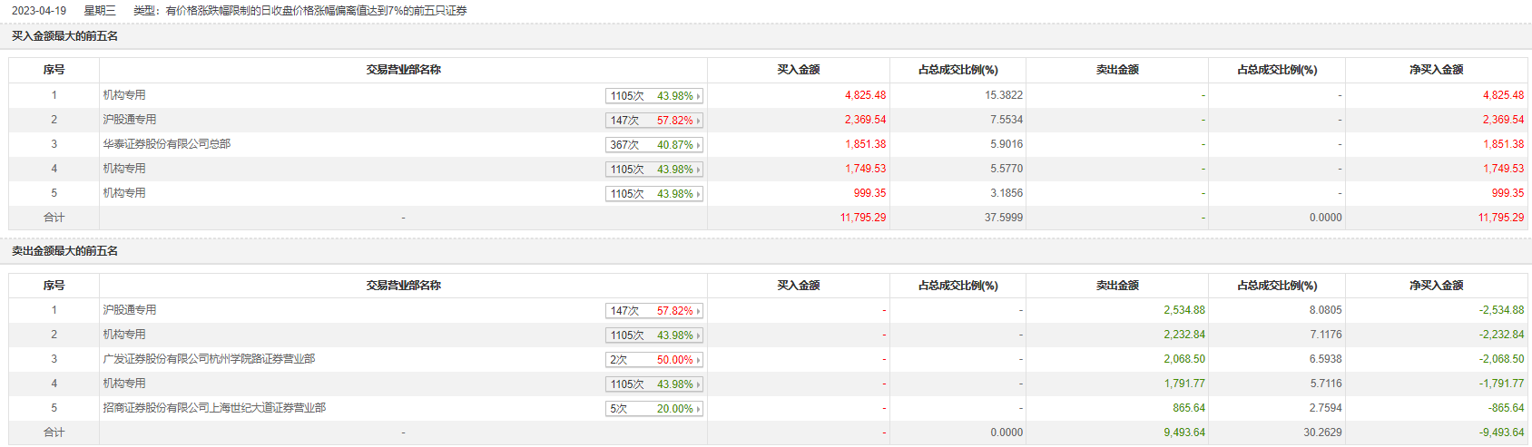 具体来看,机构买入7574.37万元,卖出4024.61万元,合计净买入3549.76万元。此外,沪股通专用、华泰证券总部分别买入2369.54万元、1851.38万元;沪股通专用、广发证券杭州学院路证券营业部分别卖出2534.88万元、2068.50万元。