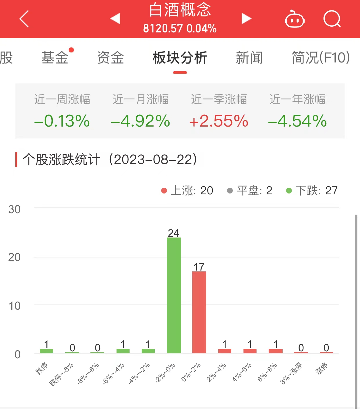 中国经济网北京8月22日讯今日,白酒概念板块整体涨幅0.04%,其中20只股票上涨,2只股票平盘,27只股票下跌。