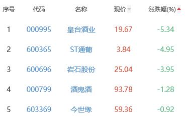 皇台酒业(维权)、ST通葡、岩石股份(维权)、酒鬼酒、今世缘位列涨幅榜后五位,涨幅分别为-5.34%、-4.95%、-3.95%、-1.28%、-0.92%。