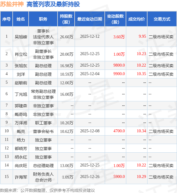 苏盐井神的高管列表及最新持股情况如下: