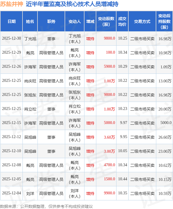 证券之星消息,根据12月30日市场公开信息、上市公司公告及交易所披露数据整理,苏盐井神(603299)最新董监高及相关人员股份变动情况:2025年12月30日公司董事丁光旭共增持公司股份9800.0股,占公司总股本为0.0013%。变动期间公司股价上涨1.36%,12月30日当日收盘报10.44元。
