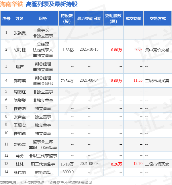 海南华铁的高管列表及最新持股情况如下: