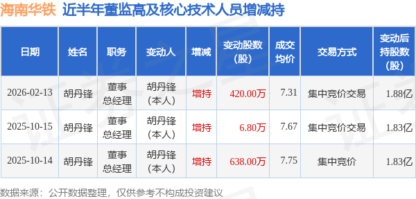 证券之星消息,根据2月13日市场公开信息、上市公司公告及交易所披露数据整理,海南华铁(603300)最新董监高及相关人员股份变动情况:2026年2月13日公司董事,总经理胡丹锋共增持公司股份420.0万股,占公司总股本为0.2103%。变动期间公司股价下跌1.64%,2月13日当日收盘报7.21元。