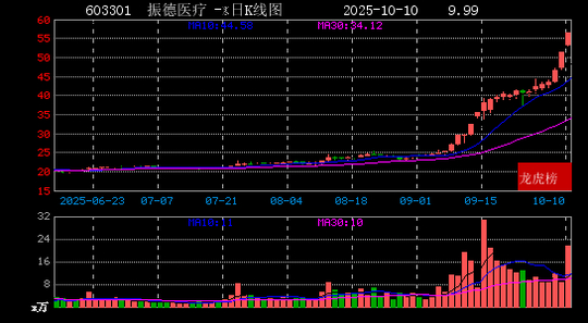 截止收盘,振德医疗报收56.46元/股,涨幅9.99%,成交量21万手,成交额11.95亿元,换手率8.07%。今日2板。