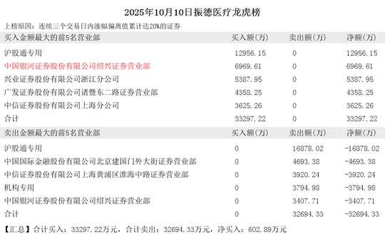【汇总】合计买入:33297.22万元,合计卖出:32694.33万元,净买入:602.89万元。