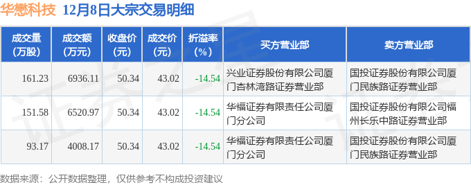 12月8日华懋科技现3笔折价14.54%的大宗交易 合计成交1.75亿元