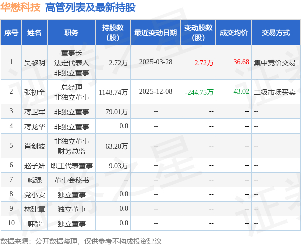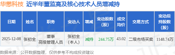 华懋科技近半年内的董监高及核心技术人员增减持详情如下:
