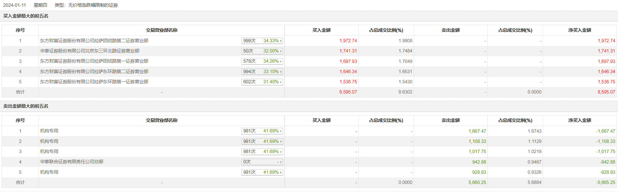 西典新能1月11日涨43.69%,全天换手率达68.37%,振幅达19.12%。龙虎榜数据显示,营业部席位合计净买入2929.81万元。其中,机构合计净卖出4722.37万元。此外,东方财富证券拉萨团结路第二证券营业部、华泰证券北京东三环北路证券营业部分别买入1972.74万元、1741.31万元;华泰联合证券总部分别卖出942.88万元。
