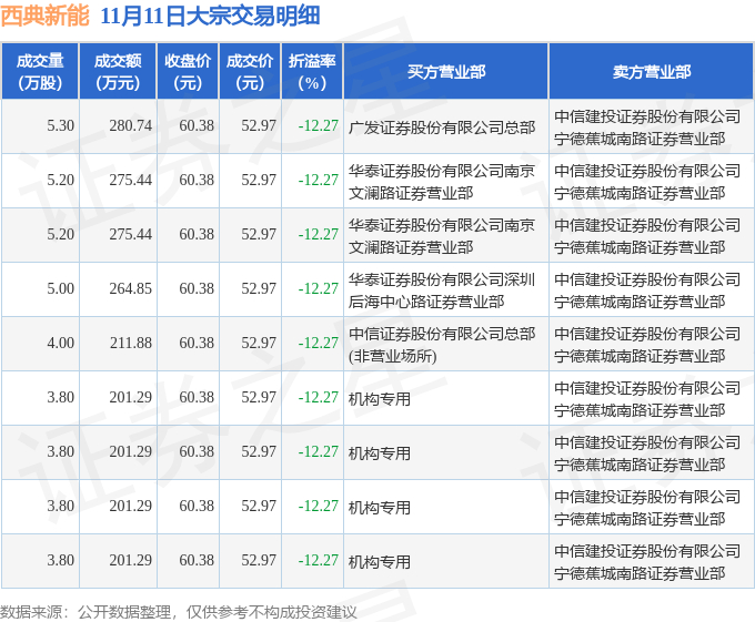 11月11日西典新能现9笔折价12.27%的大宗交易 合计成交2113.51万元