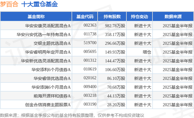 根据2025基金半年报公募基金重仓股数据,重仓该股的公募基金共11家,其中持有数量最多的公募基金为华安基金的华安安康灵活配置混合A。华安安康灵活配置混合A目前规模为19.88亿元,最新净值1.8758(9月25日),较上一交易日下跌0.11%,近一年上涨11.2%。该公募基金现任基金经理为石雨欣 陆奔。石雨欣在任的基金产品包括:华安稳固收益债券A,管理时间为2016年3月22日至今,期间收益率为97.18%;华安添祥6个月持有混合A,管理时间为2021年7月23日至今,期间收益率为18.4%;华安鼎安优选一年持有混合A,管理时间为2022年6月2日至今,期间收益率为17.04%。陆奔在任的基金产品包括:华安新优选灵活配置混合A,管理时间为2020年1月23日至今,期间收益率为43.91%;华安睿明两年定开混合A,管理时间为2020年1月23日至今,期间收益率为142.11%;华安添瑞6个月混合A,管理时间为2020年6月22日至今,期间收益率为29.47%。
