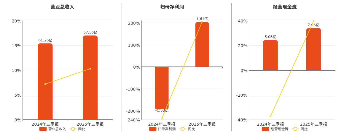 公司营业总收入为67.56亿元。归母净利润为1.61亿元。经营活动现金净流入为7.06亿元。