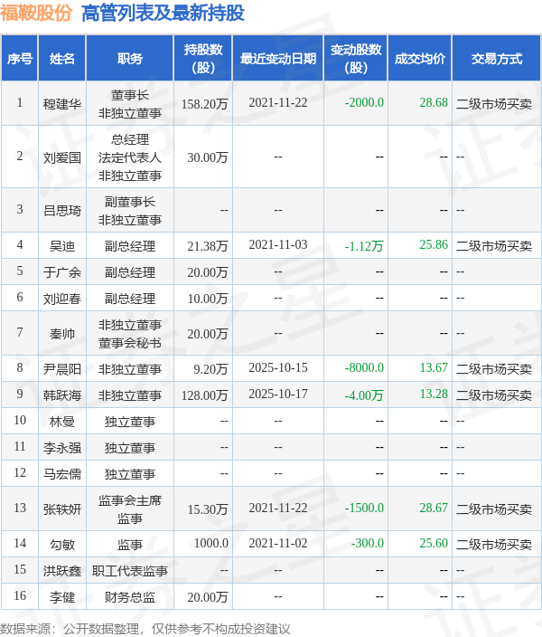 证券之星消息,根据11月18日市场公开信息、上市公司公告及交易所披露数据整理,福鞍股份(603315)最新董监高及相关人员股份变动情况:2025年11月18日公司董事韩跃海共减持公司股份1.0万股,占公司总股本为0.0031%。变动期间公司股价下跌1.85%,11月18日当日收盘报15.4元。
