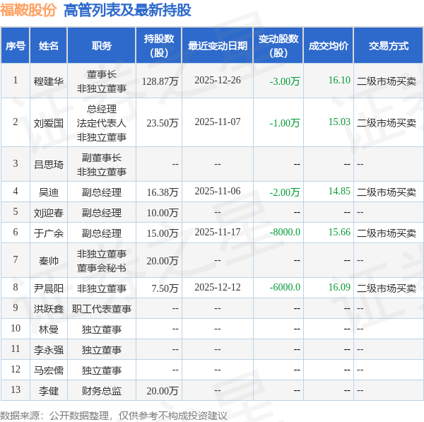 福鞍股份的高管列表及最新持股情况如下: