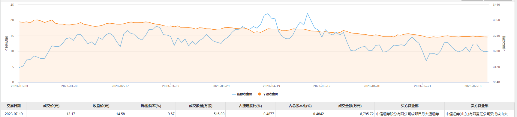 大宗交易成交516万股,成交额6795.72万元,占当日总成交额的55.9%,成交价13.17元,较市场收盘价14.58元折价9.67%。