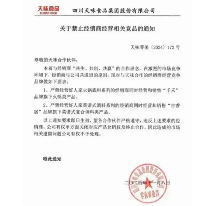 2024年11月,天味食品曾要求经销商严禁经营“千禾”火锅类产品及“吉香居”品牌旗下菜谱式复合调料类产品,引发行业热议。