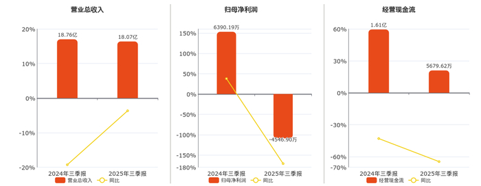公司营业总收入为18.07亿元,在已披露的同业公司中排名第21,较去年同报告期营业总收入减少6884.16万元,同比较去年同期下降3.67%。归母净利润为-4546.90万元,在已披露的同业公司中排名第29,较去年同报告期归母净利润减少1.09亿元,同比较去年同期下降171.15%。经营活动现金净流入为5679.62万元,在已披露的同业公司中排名第22,较去年同报告期经营活动现金净流入减少1.04亿元,同比较去年同期下降64.72%。