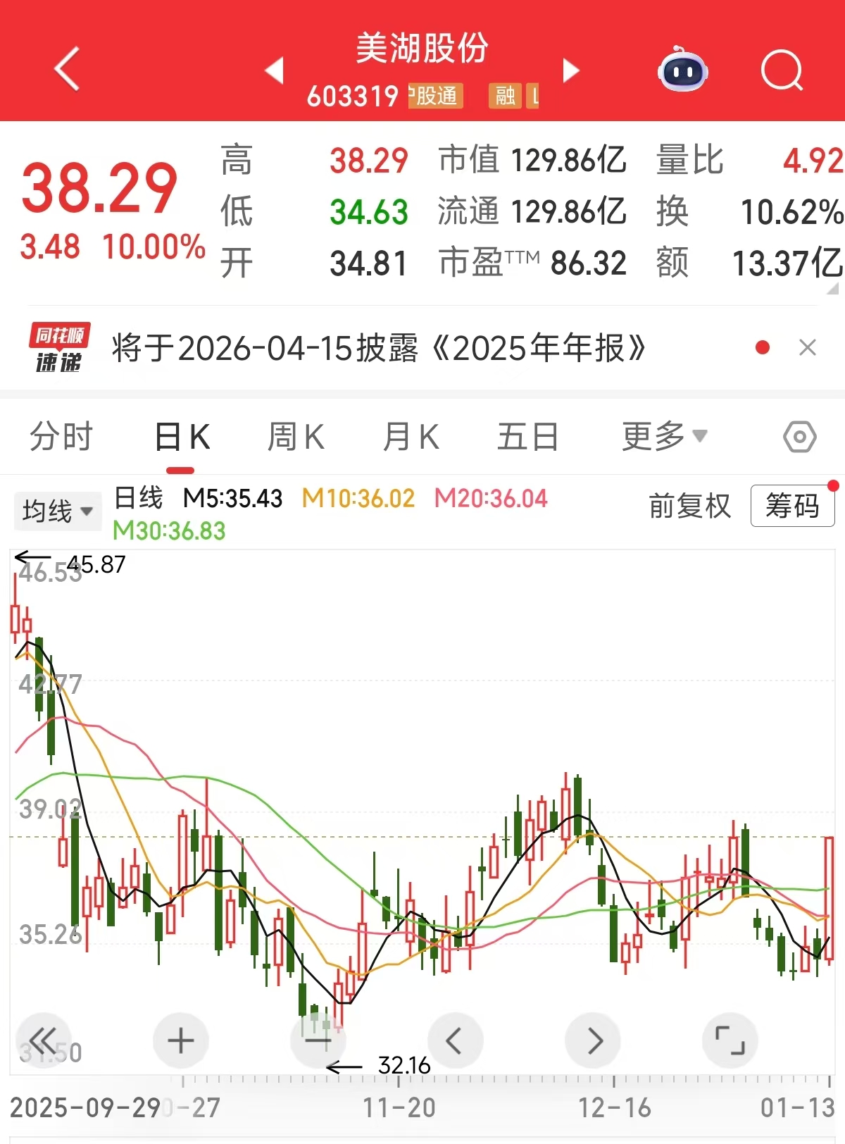 上证报中国证券网讯(记者 窦世平)截至1月13日午间收盘,美湖股份涨停,报38.29元/股。
