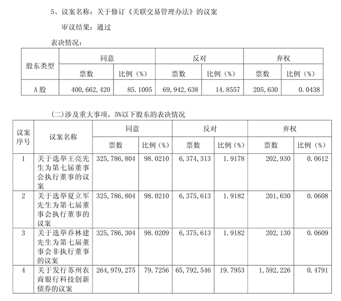 公告显示,根据表决情况,关于发行苏州农商银行科创债的议案中,有13.9743%的股东投出反对票,持股5%以下股东的反对票达6579.25万票,占比19.7953%。
