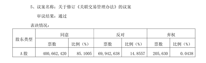 除此之外,关于修订《关联交易管理办法》的议案共获得4亿票同意票,占比为85.1005%,反对票6994.26万票,占比14.8557%。