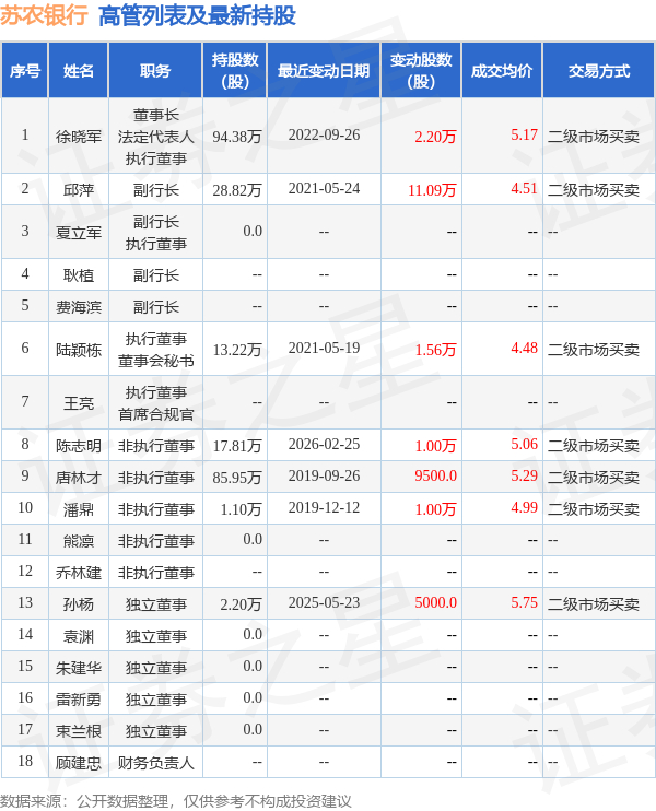 苏农银行近半年内的董监高及核心技术人员增减持详情如下:
