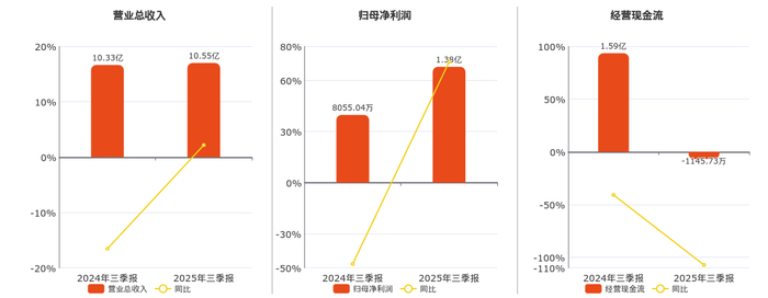 公司营业总收入为10.55亿元。归母净利润为1.38亿元。经营活动现金净流入为-1145.73万元,较去年同报告期经营活动现金净流入减少1.70亿元,同比较去年同期下降107.21%。