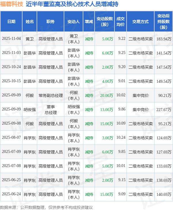 福蓉科技近半年内的董监高及核心技术人员增减持详情如下: