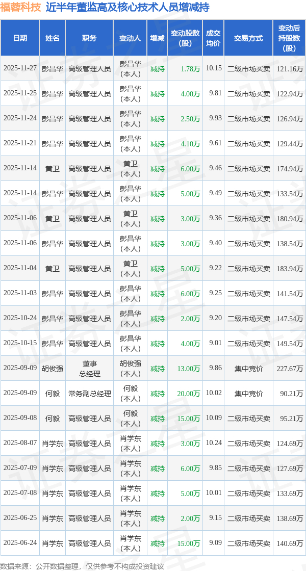 福蓉科技近半年内的董监高及核心技术人员增减持详情如下: