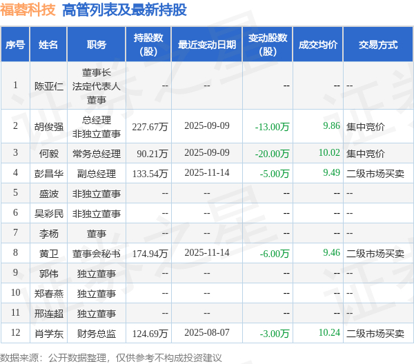 福蓉科技的高管列表及最新持股情况如下: