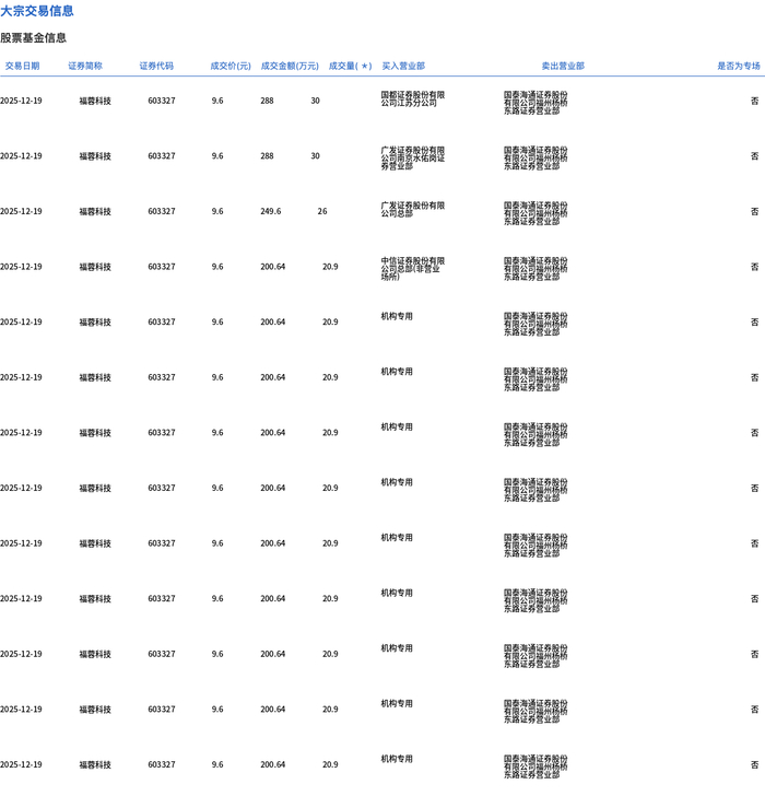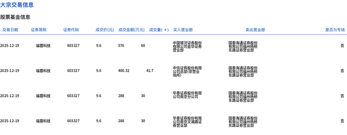 12月19日,福蓉科技大宗交易成交456.7万股,成交额4384.32万元,占当日总成交额的5.79%,成交价9.6元,较市场收盘价10.93元折价12.17%。