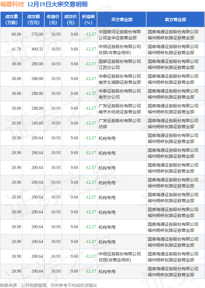 12月19日福蓉科技现17笔折价12.17%的大宗交易 合计成交4384.32万元