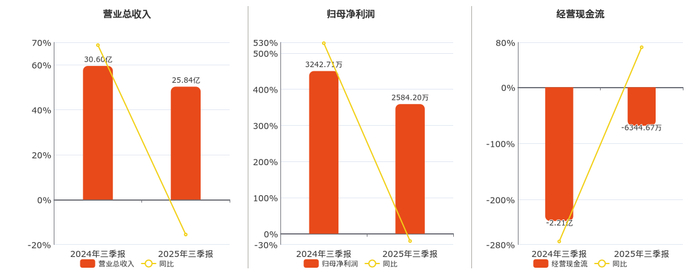 公司营业总收入为25.84亿元,在已披露的同业公司中排名第22,较去年同报告期营业总收入减少4.75亿元,同比较去年同期下降15.54%。归母净利润为2584.20万元,在已披露的同业公司中排名第30,较去年同报告期归母净利润减少658.52万元,同比较去年同期下降20.31%。经营活动现金净流入为-6344.67万元,在已披露的同业公司中排名第28,较去年同报告期经营活动现金净流入增加1.57亿元。