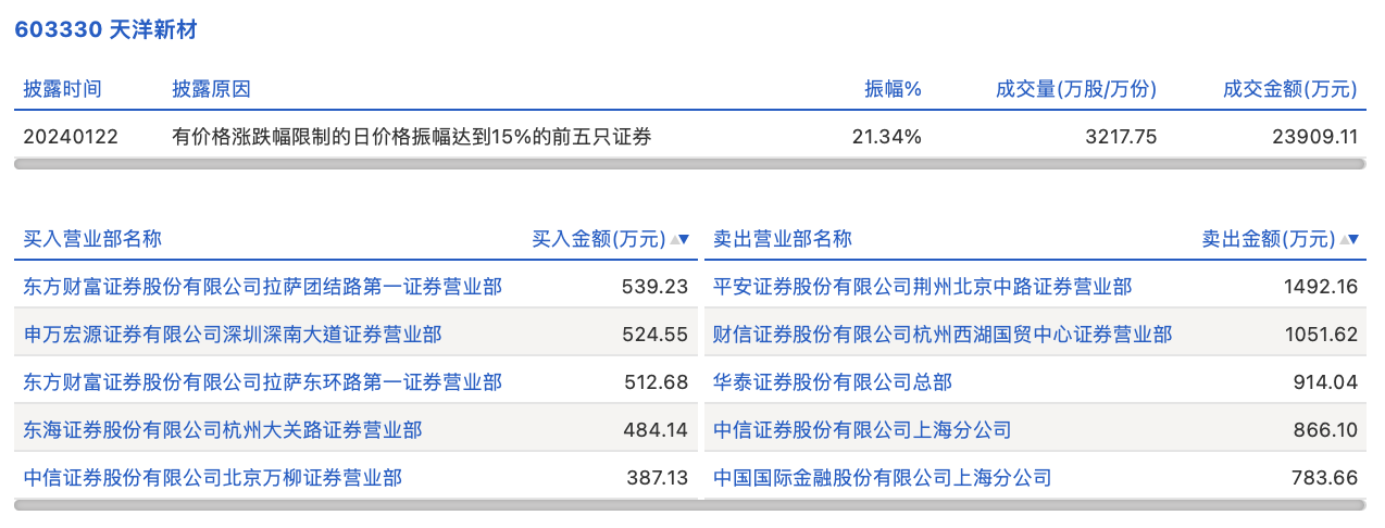 1月22日,天洋新材今日跌7.98%,全天换手率达7.54%,振幅达19.35%。龙虎榜数据显示,营业部席位合计净卖出2659.84万元。其中,平安证券荆州北京中路证券营业部、财信证券杭州西湖国贸中心证券营业部分别卖出1492.16万元、1051.62万元;东方财富证券拉萨团结路第一证券营业部、申万宏源证券有限公司深圳深南大道证券营业部分别买入539.23万元、524.55万元。
