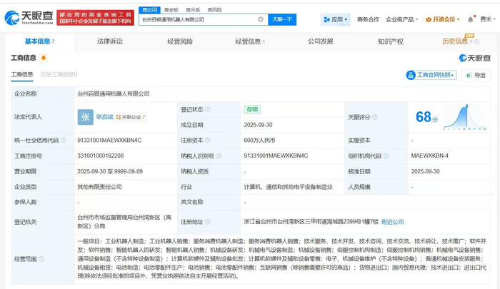 天眼查App显示,近日,台州百银通用机器人有限公司成立,法定代表人为张启斌,注册资本600万人民币,经营范围包括工业机器人制造、工业机器人销售、服务消费机器人制造等,由百达精工(603331)、北京银河通用机器人有限公司、台州百聚灿达企业管理合伙企业(有限合伙)共同持股。