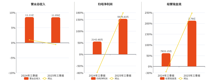 公司营业总收入为11.05亿元,较去年同报告期营业总收入减少653.32万元,同比较去年同期下降0.59%。归母净利润为5974.63万元。经营活动现金净流入为2.76亿元。