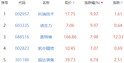 其中,科瑞技术、迪生力、奥特维、凯中精密和超达装备位列板块涨幅前五位,涨幅分别为9.97%、9.97%、7.98%、7.07%和6.74%。