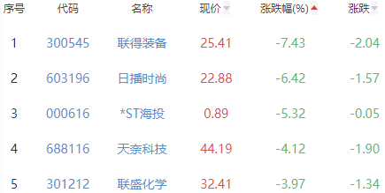 联得装备、日播时尚、*ST海投、天奈科技和联盛化学位列涨幅榜后五位,涨幅分别为-7.43%、-6.42%、-5.32%、-4.12%和-3.97%。